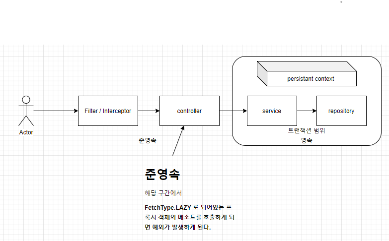 글로벌 페치전략을 수정하여 EAGER 를 사용하거나 특정 환경에서 JPQL fectch join 을 사용한다거나 어찌됬든 새로운 계층을 추가하는 경우도 모두 트랜잭션이 종료된 상황에서 영속성 컨텍스트도 없어지기 때문에 발생하는 문제이다.